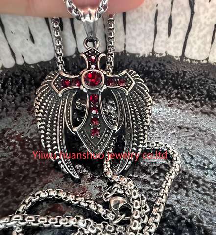 빨간 모조 다이아몬드 스테인레스 스틸과 천사의 날개 크로스 목걸이